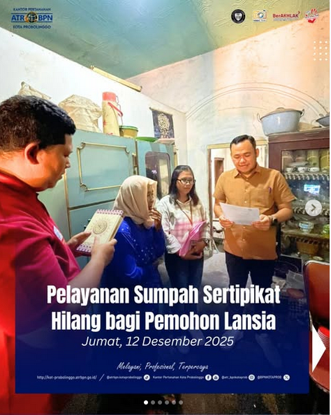 Pada hari ini Jumat, 12 Desember 2025 telah dilaksanakan sumpah sertipikat hilang atas sertipikat Hak Milik Nomor 00162 Kelurahan Triwung Kidul Kecamatan Kademangan Kota Probolinggo. Dalam kesempatan ini Kepala Seksi Penetapan Hak dan Pendaftaran Bapak Nur Said, S.M., QRMO. beserta staff melaksanakan sumpah bertempat di rumah pemohon Ibu Paija yang berumur 86 tahun (Lansia).
