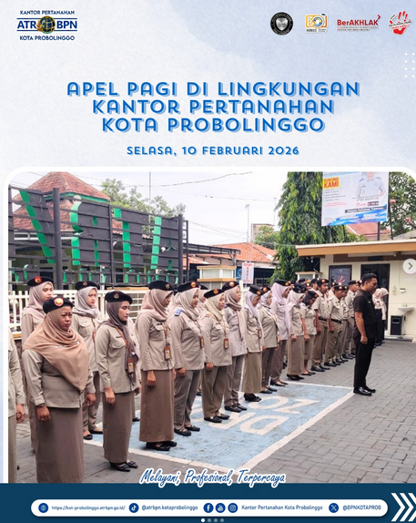 Pada hari ini Selasa, 10 Februari 2026 Kantor Pertanahan Kota Probolinggo melaksanakan Apel Pagi. Pada kesempatan Apel Pagi yang dipimpin langsung oleh Kepala Seksi Pengendalian dan Penanganan Sengketa Kantor Pertanahan Kota Probolinggo Ibu Emy Haniah, S.H., M.Kn. ini dalam amanatnya, beliau menyampaikan pentingnya pemetaan partisipatif masyarakat sebagai bentuk peningkatan kualitas data sehingga dapat menghindari adanya sertipikat ganda dan meminimalisir terjadinya sengketa batas seperti tumpang tindih lahan.