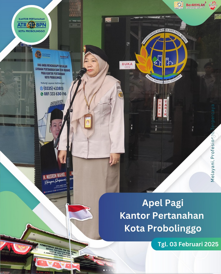 Pada kesempatan Apel Pagi yang dipimpin oleh Plt. Kepala Sub Bagian Tata Usaha, Ibu Neny Dwianingsih, S.ST , beliau menyampaikan 8 Program Pilar Emas JATIM HEBAT yang menjadi program kerja di TA. 2025. Beliau juga mengingatkan untuk meningkatkan kualitas pelayanan dan kinerja kepada seluruh pegawai. Sebagai penutup beliau menyampaikan agar kita senantiasa bersyukur atas nikmat sehat yg diberikan oleh Allah SWT. Apel pagi ini diikuti oleh Pejabat Pengawas, Koordinator Kelompok Substansi dan seluruh pegawai Kantor Pertanahan Kota Probolinggo.
