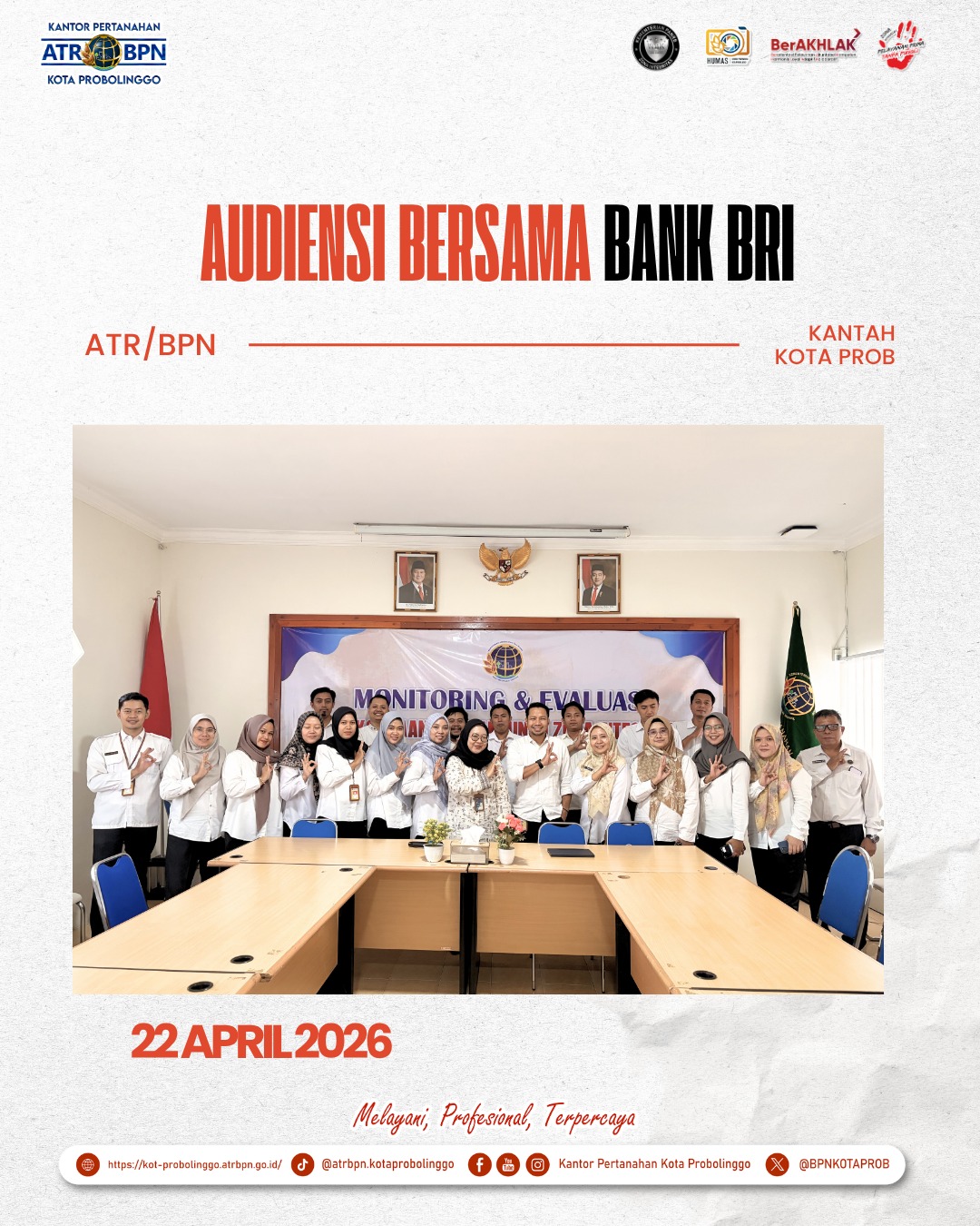 Kantor Pertanahan Kota Probolinggo menerima audiensi dari pihak Bank BRI dalam rangka mempererat sinergi antar instansi serta membangun koordinasi yang baik dalam mendukung pelayanan pertanahan kepada masyarakat pada hari Rabu, 22 April 2026.
