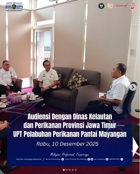 Pada hari ini Rabu, 10 Desember 2025 Kepala Kantor Pertanahan Kota Probolinggo bersama dengan Kepala Seksi Survei dan Pemetaan, Kepala Seksi Penetapan Hak dan Pendaftaran, Kepala Seksi Penataan dan Pemberdayaan, dan Kepala Seksi Pengendalian dan Penanganan Sengketa beserta staff melaksanakan audiensi ke dengan Dinas Kelautan dan Perikanan Provinsi Jawa Timur UPT Pelabuhan Perikanan Pantai Mayangan Kota Probolinggo.