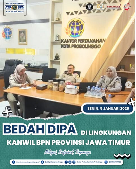 Pada hari ini Senin, 5 Januari 2026 Kantor Pertanahan Kota Probolinggo mengikuti rapat daring mengenai Bedah DIPA 2026 yang diselenggarakan oleh Kanwil BPN Provinsi Jawa Timur. Kegiatan ini dihadiri oleh Kepala Kantor Pertanahan Kota Probolinggo, Kepala Subbagian Tata Usaha, Kepala Seksi Survei dan Pemetaan, Kepala Seksi Penetapan Hak dan Pendaftaran, Kepala Seksi Penataan dan Pemberdayaan, Penanggung Jawab Kegiatan Keuangan dan Barang Milik Negara serta Penanggung Jawab Kegiatan Perencanaan, Evaluasi dan Pelaporan