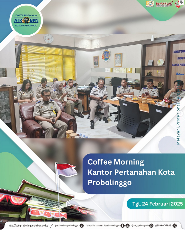 Pada Hari Senin Tanggal 24 Februari 2025 Kantor Pertanahan Kota Probolinggo melaksanakan giat Coffee Morning di ruang Kepala Kantor yang dipimpin oleh Bapak Kepala Kantor Pertanahan Kota Probolinggo, Bapak Arli Buchari, S.T., M.M dan dihadiri oleh Pejabat Pengawas, Koordinator Kelompok Substansi dan koordinator kegiatan.