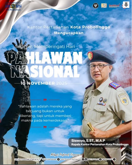 Segenap keluarga Kantor Pertanahan Kota Probolinggo mengucapkan Selamat Memperingati Hari Pahlawan Tahun 2025.