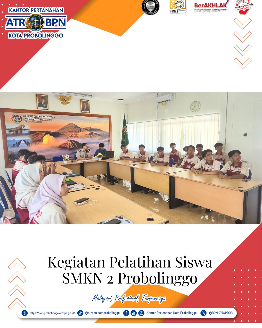 Pada hari ini Senin, 06 April 2026 telah dilaksanakan Kegiatan pelatihan bagi siswa magang SMKN 2 Probolinggo yang bertempat di Ruang Aula Kantor Pertanahan Kota Probolinggo. Kegiatan ini merupakan bagian dari upaya peningkatan kompetensi dan kesiapan siswa dalam menghadapi dunia kerja.