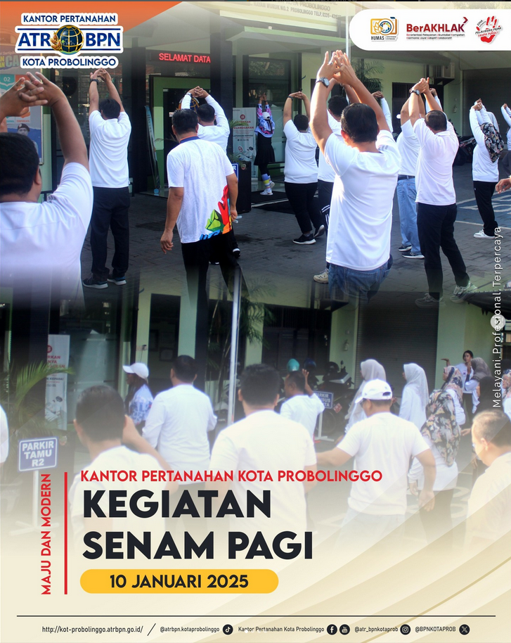 Pada Hari Jum’at, 10 Januari 2025 Kantor Pertanahan Kota Probolinggo mengadakan kegiatan Senam Pagi yang diikuti oleh seluruh pegawai dan dilaksanakan sebelum jam pelayanan dibuka.
