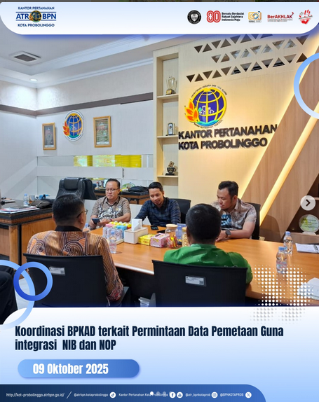 Halo#SobATRBPN Kantor Pertanahan Kota Probolinggo dengan BPKAD Kota Probolinggo melakukan rapat koordinasi terkait Sertipikasi aset Pemerintah Kota Probolinggo, Perencanaan Host to Host NIB dan NOP, serta Hibah aset tanah dari Pemerintah Kota Probolinggo ke Kantor Pertanahan Kota Probolinggo. Kolaborasi, koordinasi, dan kerjasama ini diharapkan dapat memberi manfaat nyata bagi masyarakat Kota Probolinggo. Dalam kesempatan ini juga, BPKAD Kota Probolinggo dihadiri Kepala Badan Pengelolaan Pendapatan, Keuangan dan Aset Daerah (BPPKAD) Kota Probolinggo, Bapak Pujo Agung Satrio, S.STP, M.Si bersama Kepala Kantor Pertanahan Kota Probolinggo Bapak Siswoyo,S.ST.,M.A.P beserta jajaran melakukan rapat koordinasi yang bertempat di Ruang Rapat Kepala Kantor Pertanahan Kota Probolinggo.