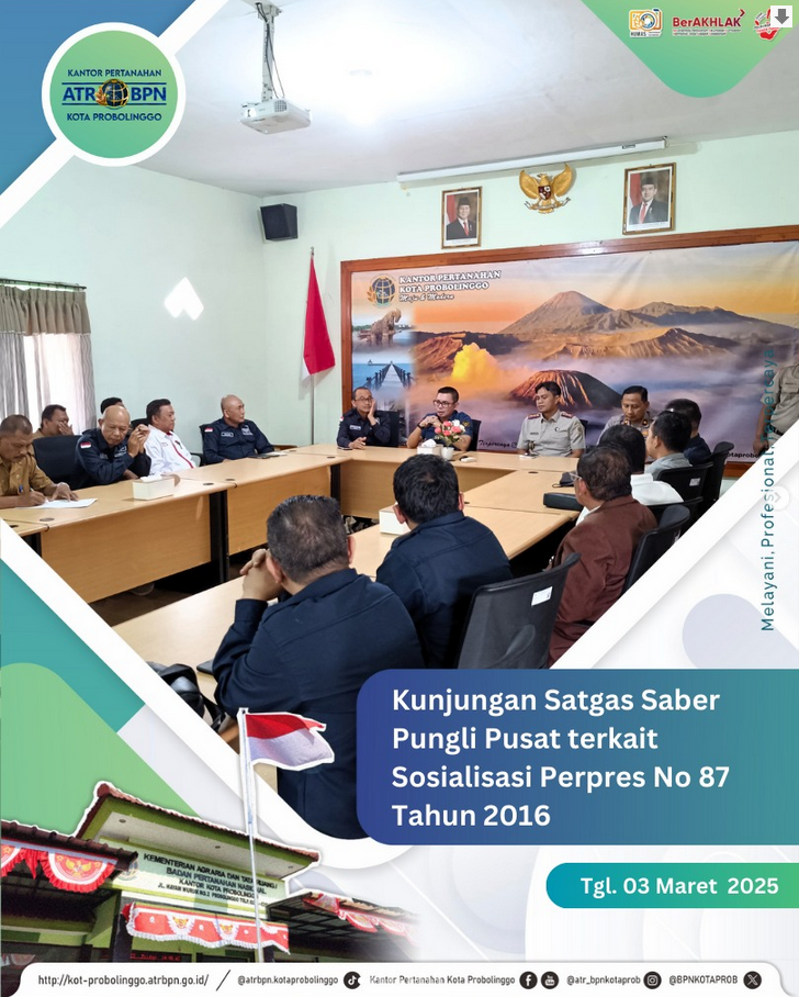 Pada Hari Senin Tanggal 03 Maret 2025 Kantor Pertanahan Kota Probolinggo menerima kunjungan Satuan Tugas Sapu Bersih Pungutan Liar (Saber Pungli) Pusat . Adapun kunjungan tersebut tertuju ke beberapa kantor pelayanan salah satunya Kantor Pertanahan Kota Probolinggo. Kegiatan sosialisasi ini dihadiri oleh Bapak Kepala Kantor Pertanahan Kota Probolinggo , Bapak Arli Buchari , S.T., M.M beserta pejabat pengawas.