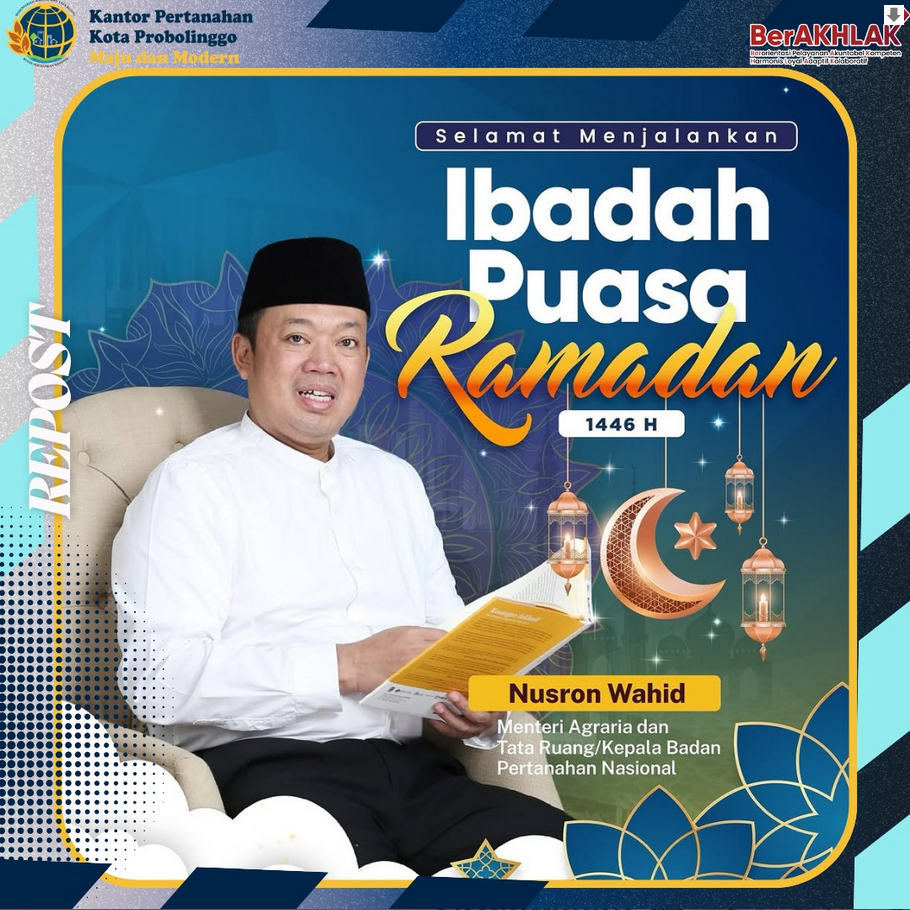 Mewakili seluruh keluarga besar Kementerian ATR/BPN, Menteri ATR/Kepala BPN, Nusron Wahid mengucapkan Selamat menunaikan Ibadah Puasa Ramadan 1446 Hijriah, untuk seluruh umat Islam di seluruh Indonesia.