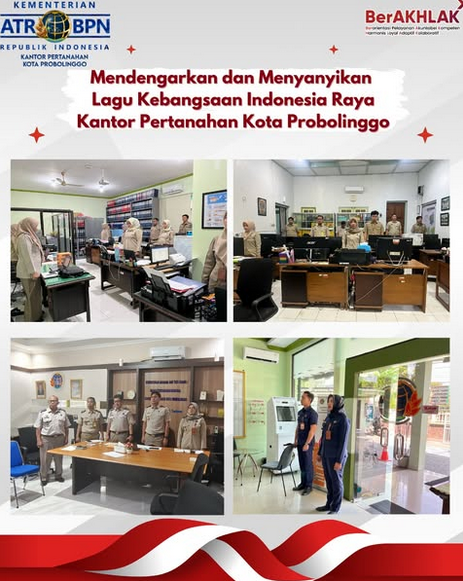 Kegiatan tindak lanjut surat pemberitahuan Kementerian ATR/BPN untuk memutar Lagu Indonesia Raya dan bersikap sempurna . Halo #sobATRBPN Kantah Kota Probolinggo telah melaksanakan instruksi pemutaran Lagu Kebangsaan Indonesia Raya dan naskah-naskah kebangsaan lainnya secara bergantian setiap Senin hingga Jumat pukul 10.00 WIB, terhitung mulai hari Senin, 10 Februari 2025. . Dalam pelaksanaannya, seluruh jajaran pegawai Kantor Pertanahan Kota Probolinggo dengan penuh semangat dan khidmat menyanyikan Lagu Kebangsaan Indonesia Raya setiap hari Senin dan Kamis, sesuai dengan Undang-Undang Nomor 24 Tahun 2009 tentang Bendera, Bahasa, dan Lambang Negara, serta Lagu Kebangsaan. Pegawai diwajibkan berdiri tegak dengan sikap sempurna sebagai bentuk penghormatan terhadap lagu kebangsaan. ,mendengarkan Naskah Pancasila, setiap hari Selasa dan Jumat dan mendengarkan Panca Prasetya KOPRI, setiap hari Rabu . Kegiatan ini bertujuan untuk menumbuhkan rasa nasionalisme, memperkuat jiwa kebangsaan, serta meningkatkan kecintaan terhadap Tanah Air di lingkungan kerja Kantor Pertanahan Kota Probolinggo. Dengan adanya kegiatan ini, diharapkan seluruh pegawai dapat lebih menghayati makna kebangsaan serta terus berkontribusi dalam memberikan pelayanan terbaik bagi masyarakat dengan penuh integritas dan semangat kebangsaan.