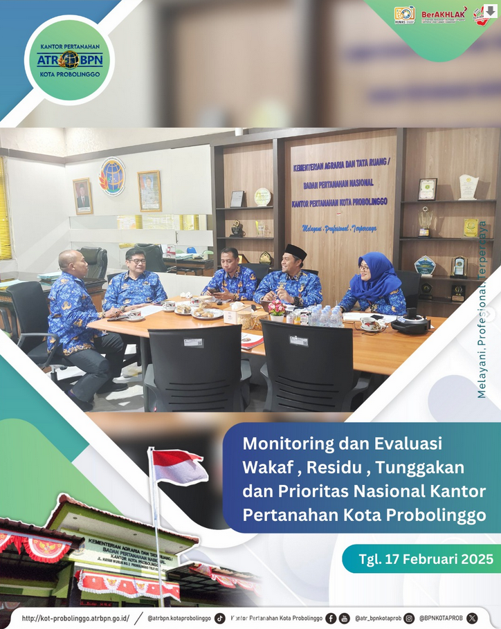 Pada Hari Senin Tanggal 17 Februari 2025 Kantor Pertanahan Kota Probolinggo menghadiri Monitoring dan Evaluasi yang diadakan oleh Kantor Wilayah Badan Pertanahan Nasional Provinsi Jawa Timur secara daring . Kegiatan Monitoring dan Evaluasi ini dipimpin langsung oleh Bapak Kepala Kantor Wilayah Badan Pertanahan Nasional Provinsi Jawa Timur , Bapak Asep Heri, S.H., M.H., QMRP dan dihadiri oleh seluruh Kepala Kantor Pertanahan beserta pejabat pengawas Provinsi Jawa Timur
