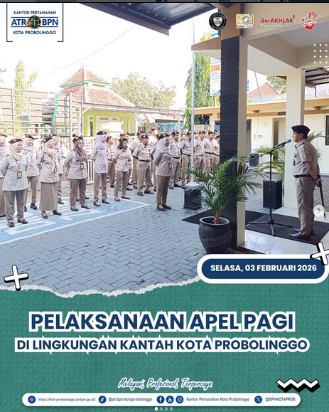 Pada hari ini Selasa, 3 Februari 2026 Kantor Pertanahan Kota Probolinggo melaksanakan Apel Pagi. Pada kesempatan Apel Pagi yang dipimpin langsung oleh Kepala Kantor Pertanahan Kota Probolinggo Bapak Siswoyo, S.ST., M.A.P ini dalam amanatnya, beliau menyampaikan mengenai pelaksanaan perjanjian kerjasama antara BPN dengan Lembaga Pendidikan setempat sebagai langkah untuk peningkatan kualitas data dengan melibatkan pihak eksternal sebagai tim pelaksana percepatan.