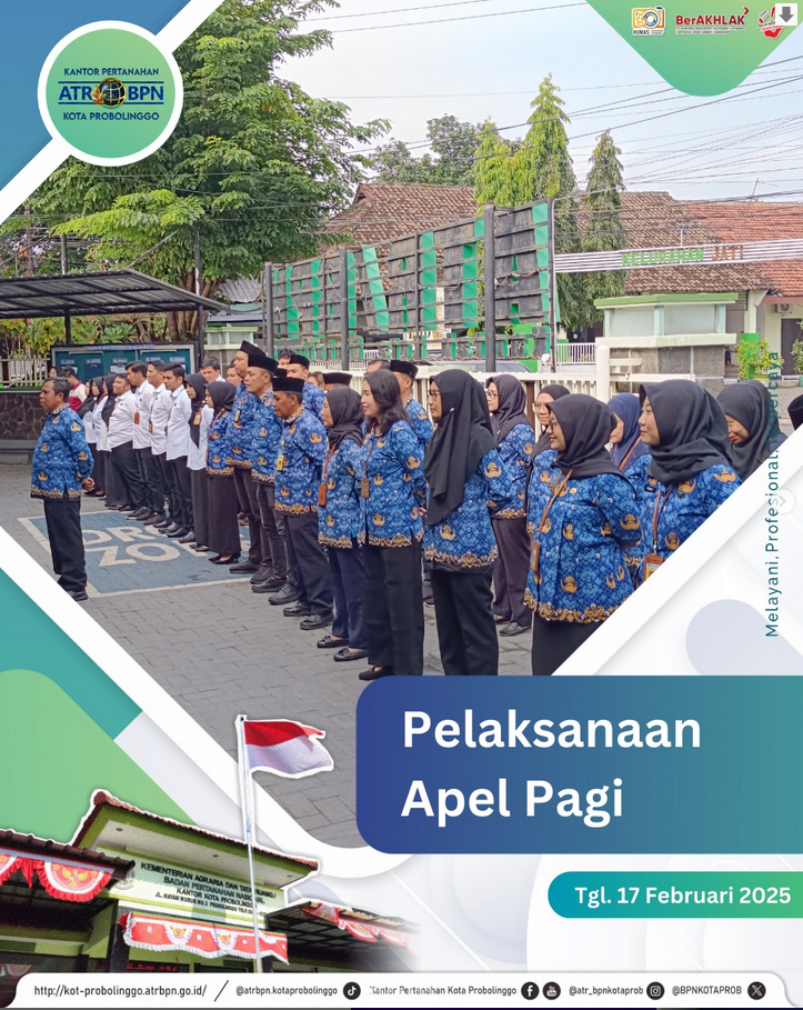 Pada kesempatan Apel Pagi yang dipimpin oleh Kepala Kantor Pertanahan Kota Probolinggo , Bapak Arli Buchari,S.T.,M.M.,QRMP , Beliau memberikan semangat untuk tetap meningkatkan kualitas pelayanan dan kinerja kepada seluruh pegawai. Bapak Arli juga mengucapkan selamat, terima kasih, dan permohonan maaf kepada pegawai yang mutasi pada hari ini , Semoga silahturahmi tetap terjaga