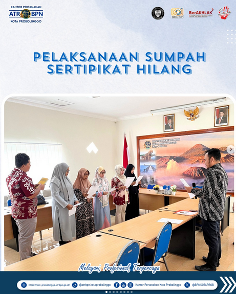 Telah dilaksanakan sumpah sertipikat hilang atas Sertipikat Hak Milik Nomor 00373/Sumbertaman an. Kartini, Nomor 01723/Triwung Lor a.n. Andalas Wati Puji Rahayu, Nomor 00102/Jati an. Abdol Adjis, dan Nomor 01548/Curahgrinting an. Adhi Suwanti