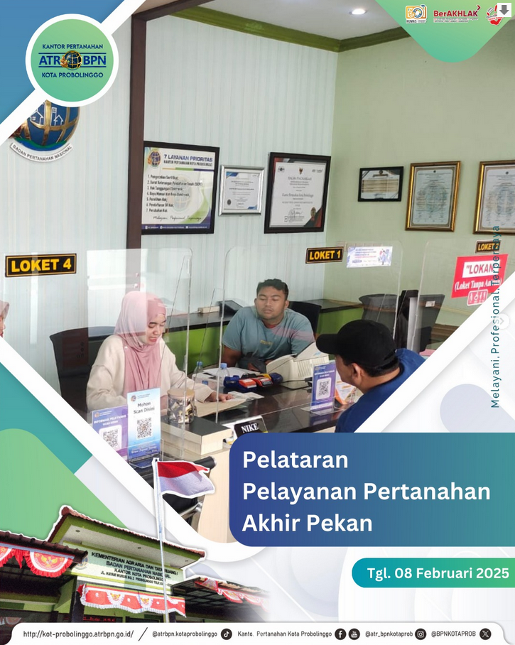 Bagi warga masyarakat yang membutuhkan layanan pertanahan dan tidak bisa datang ke loket layanan di hari Senin-Jumat, sekarang bisa datang di akhir pekan pada hari Sabtu ke Kantor Pertanahan Kota Probolinggo.