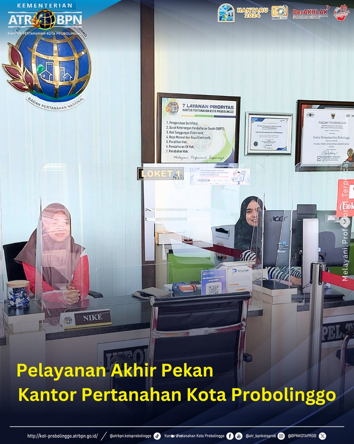 Bagi warga masyarakat yang membutuhkan layanan pertanahan dan tidak bisa datang ke loket layanan di hari Senin-Jumat, sekarang bisa datang di akhir pekan pada hari Sabtu ke Kantor Pertanahan Kota Probolinggo.