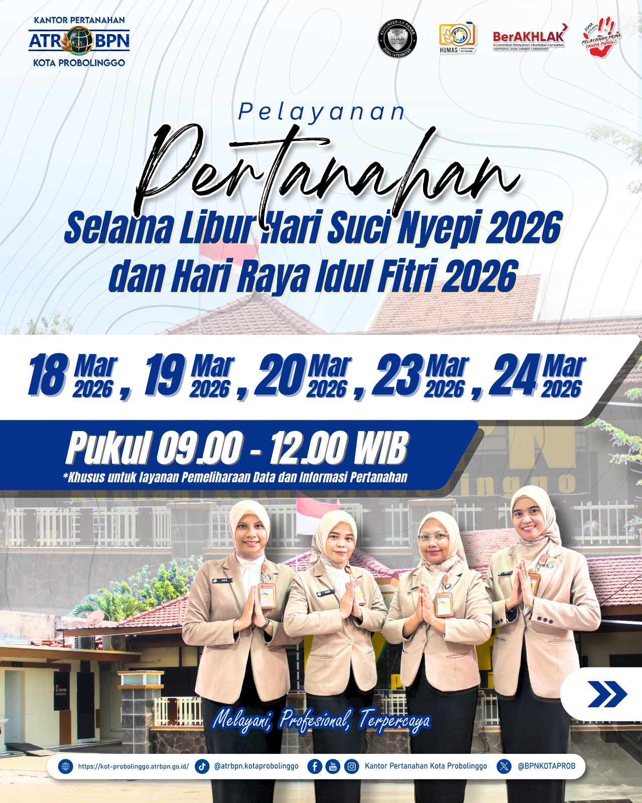 Ada kabar bahagia nih bagi kalian yang akan mengurus pelayanan pertanahan karena dengan adanya penyesuaian dalam rangka Libur Nasional dan Cuti Bersama Hari Raya Suci Nyepi Tahun Baru Saka 1948 dan Hari Raya Idul Fitri 1447 H, Kantor Pertanahan Kota Probolinggo tetap membuka pelayanan terbatas sesuai dengan jadwal yaitu pada tanggal :
