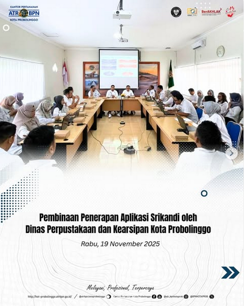 Pada hari ini Rabu, 19 November 2025 Kantor Pertanahan Kota Probolinggo melaksanakan pembinaan pengelolaan aplikasi SRIKANDI dengan narasumber dari Dinas Perpustakaan dan Kearsipan Kota Probolinggo. Kegiatan ini dibuka oleh Kepala Kantor Pertanahan Kota Probolinggo Bapak Siswoyo, S.ST., M.A.P dan dihadiri oleh Pejabat Pengawas, Pejabat Fungsional dan seluruh staff Kantor Pertanahan Kota Probolinggo.