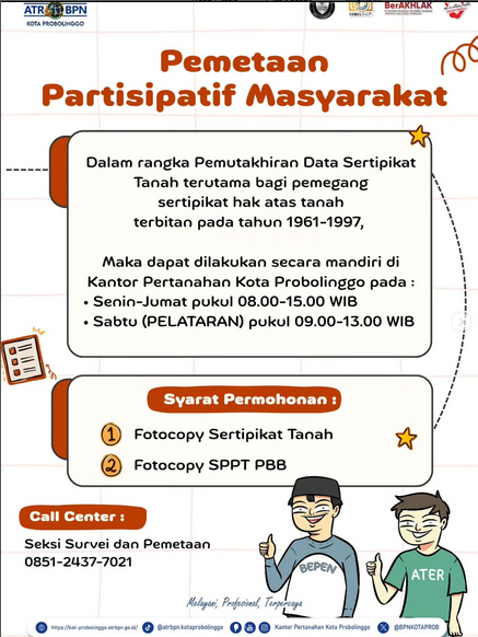 Dalam upaya memperkuat Peningkatan Kualitas Data dan Penyelesaian KW 4,5,6 maka Kantor Pertanahan Kota Probolinggo melaksanakan Pemetaan Partisipatif Masyarakat dalam rangka Pemutakhiran Data Sertipikat terutama bagi masyarakat pemegang sertipikat hak atas tanah terbitan tahun 1961-1997, dapat melakukan permohonan secara mandiri pada hari dan jam kerja Senin-Jumat pukul 08.00-14.00 WIB dan saat Loket Pelataran (Pelayanan Tanah Akhir Pekan) hari Sabtu pukul 09.00-13.00 WIB dengan membawa syarat permohonan :