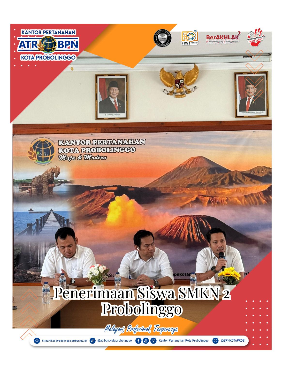 Pada hari ini Rabu, 01 April 2026 Kantor Pertanahan Kota Probolinggo telah menerima Siswa Magang dari SMK Negeri 2 Kota Probolinggo. Kegiatan penerimaan ini merupakan langkah awal dalam menjalin sinergi antara dunia pendidikan dan dunia kerja, khususnya dalam memberikan pengalaman nyata kepada para siswa terkait tugas dan fungsi pelayanan pertanahan. Diharapkan melalui kegiatan ini, para siswa dapat memperoleh wawasan, keterampilan, serta pemahaman yang lebih mendalam mengenai proses administrasi pertanahan, sekaligus menumbuhkan sikap profesional, tanggung jawab, dan etos kerja yang baik.