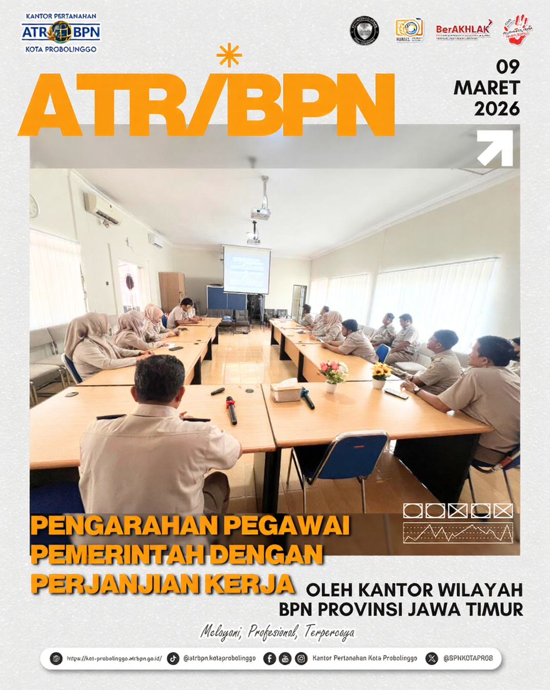 Sehubungan dengan adanya Surat Keputusan Menteri Agraria dan Tata Ruang/Kepala Badan Pertanahan Nasional Nomor 223/SK-KP.02.03/II/2026 tentang Pindah Wilayah Kerja Pegawai Pemerintah dengan Perjanjian Kerja di Lingkungan Kementerian ATR/BPN, pada hari ini Senin 9 Maret 2026 Pegawai Pemerintah dengan Perjanjian Kerja Kantor Pertanahan Kota Probolinggo beserta Analis SDM menghadiri Pengarahan Pegawai Pemerintah dengan Perjanjian Kerja di Lingkungan Kantor Wilayah BPN Provinsi Jawa Timur