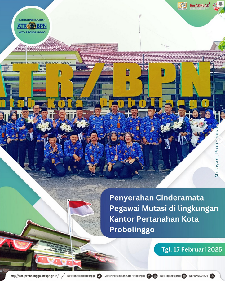 Kegiatan penyerahan cinderamata dilakukan setelah Apel Pagi. Kepala Kantor Pertanahan Kota Probolinggo menyampaikan rasa terimakasihnya kepada seluruh pegawai yang mendapatkan SK Mutasi peda periode ini, atas dedikasinya untuk kemajuan Kantor Pertanahan Kota Probolinggo. Setiap pegawai Kantor Pertanahan Kota Probolinggo merupakan pegawai yang hebat, dan kami yakin mereka dapat memberikan kinerja yang terbaik dikantor baru.