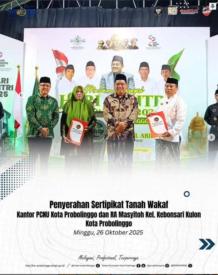 Halo #SobATRBPN Pada hari Minggu, 26 Oktober 2025 Kepala Kantor Pertanahan Kota Probolinggo menghadiri Peringatan Hari Santri Nasional 2025 sebagai wujud rasa syukur atas perjuangan para santri dan ulama dalam menjaga keutuhan bangsa dan agama. Kegiatan ini diselenggarakan oleh Pengurus Cabang Nahdlatul Ulama (PCNU) Kota Probolinggo bertempat di Klinik NU Kota Probolinggo.