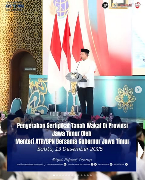 Pada hari Sabtu, 13 Desember 2025 Kantor Pertanahan Kota Probolinggo menghadiri Penyerahan Sertipikat Wakaf dan Tempat Ibadah dengan jumlah 2.532 orang penerima bertempat di Masjid Nasional Al Akbar Surabaya. Dalam kesempatan ini hadir Menteri Agraria dan Tata Ruang/Kepala Badan Pertanahan Nasional, Kepala Kantor Wilayah BPN Provinsi Jawa Timur, Gubernur Jawa Timur, Forkopimda Provinsi Jawa Timur, Walikota Probolinggo Bapak dr. H. Aminuddin Sp.OG.,(K)., M.Kes. dan Kantor Pertanahan se-Jawa Timur.