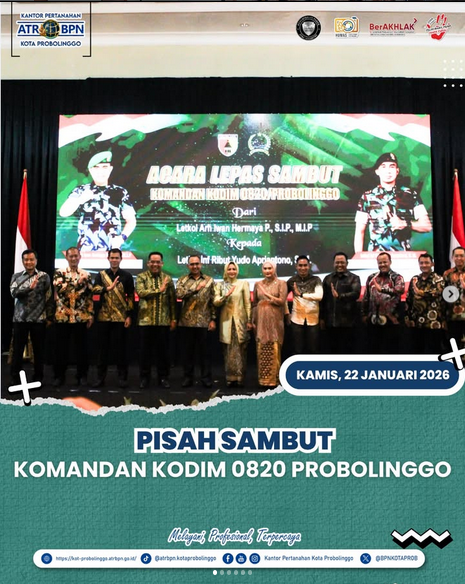 Pada hari Kamis, 23 Januari 2026 Kepala Subbagian Tata Usaha Kantor Pertanahan Kota Probolinggo menghadiri lepas sambut Komandan Kodim 0820/Probolinggo Probolinggo bertempat di Paseban Sena Kota Probolinggo. Terima kasih kepada Bapak Letnan Kolonel Arh Irwan Hermaya P., S.I.P., M.I.P. selama memimpin sebagai Komandan Kodim 0820/Probolinggo, semoga keberhasilan dan kesehatan selalu mengiringi langkah di tempat tugas yang baru dan Selamat datang kepada Bapak Letnan Kolonel Inf Ribut Yudo Aproantono, S.M. semoga diberikan kemudahan dalam menjalankan amanat sebagai Komandan Kodim 0820/Probolinggo