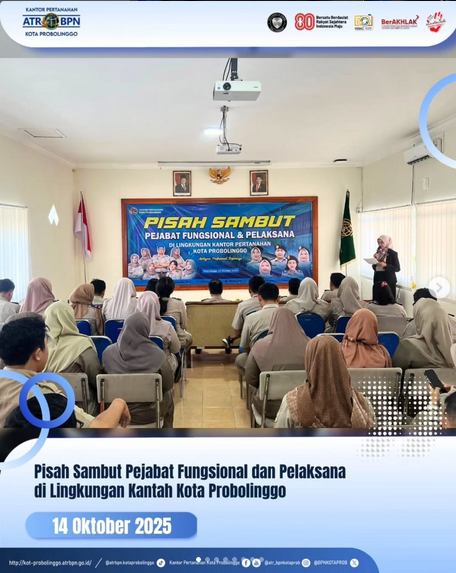 Pada hari ini Selasa, 14 Oktober 2025 Kantor Pertanahan Kota Probolinggo melaksanakan acara Pisah Sambut Pejabat Fungsional dan Pejabat Pelaksana. Acara ini menjadi momen silaturahmi sekaligus bentuk apresiasi atas pengabdian bagi pegawai yang telah menyelesaikan tugasnya, serta penyambutan pegawai baru yang akan mengemban amanah di Kantor Pertanahan Kota Probolinggo
