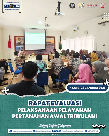 Pada hari ini Kamis, 22 Januari 2026 Kantor Pertanahan Kota Probolinggo melaksanakan rapat evaluasi pelaksanaan pelayanan pertanahan pada awal triwulan I yang bertempat di Aula Kantor Pertanahan Kota Probolinggo.