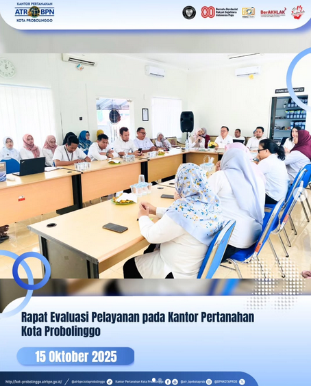Pada hari ini Rabu, 15 Oktober 2025 Kantor Pertanahan Kota Probolinggo melaksanakan rapat evaluasi pelaksanaan pelayanan pertanahan pada awal triwulan IV yang bertempat di Aula Kantor Pertanahan Kota Probolinggo.