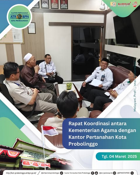 Kepala Kantor Pertanahan Kota Probolinggo , Bapak Arli Buchari ,S.T,M.M beserta pejabat pengawas mengadakan pertemuan rapat koordinasi antara Kementerian Agama dengan Kantor Pertanahan Kota Probolinggo terkait sertipikasi tanah wakaf tahun 2025. Rapat ini diadakan di Ruang Pertemuan Kantor Pertanahan Kota Probolinggo pada hari Selasa Tanggal 04 Maret 2025.
