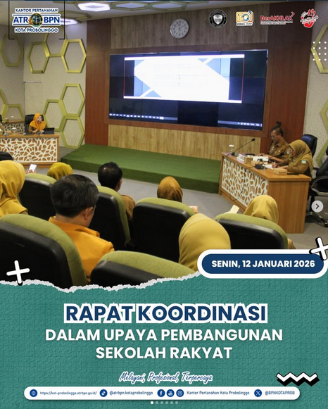 Pada hari ini Senin, 12 Januari 2026 Kepala Seksi Pengadaan Tanah dan Pengembangan Ibu Anita Puspa Dewi, S.H. menghadiri Rapat Koordinasi Pembahasan Rencana Pembangunan Sekolah Rakyat Kota Probolinggo yang diselenggarakan oleh Sekretariat Daerah Kota Probolinggo bertempat di Ruang Command Center Kantor Pemerintah Kota Probolinggo