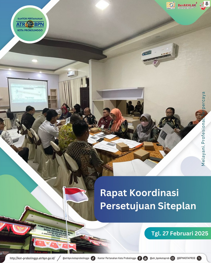 Pada Hari Kamis Tanggal 27 Februari 2025 Seksi Penataan dan Pemberdayaan Kantor Pertanahan Kota Probolinggo mengikuti Rapat Koordinasi Persetujuan Siteplan Perumahan Grand Serayu Residence . Rapat Koordinasi tersebut berlangsung di Aula Pertemuan Utara Dinas PUPR-PKP Kota Probolinggo.