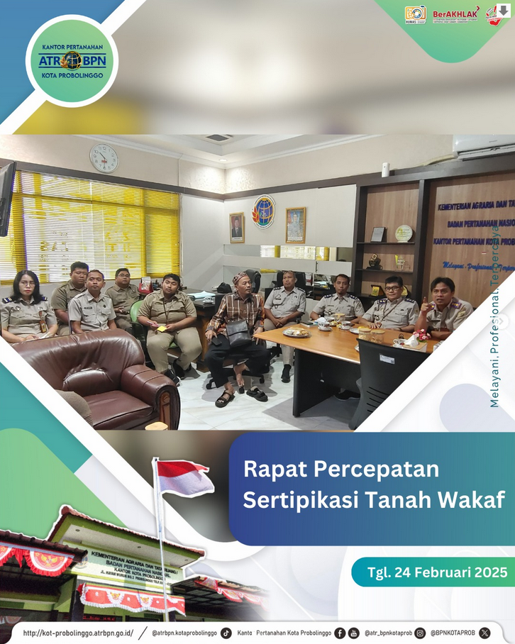 Pada Hari Senin Tanggal 24 Februari 2025 Tim Percepatan Sertipikasi Tanah Wakaf melakukan Rapat Koordinasi dengan Ketua BWI (Badan Wakaf Indonesia). Rapat ini dipimpin langsung oleh Kepala Kantor Pertanahan Kota Probolinggo beserta tim. Kegiatan tersebut diadakan di Ruang Pertemuan Kantor Pertanahan Kota Probolinggo. Rapat ini dilakukan dengan tujuan koordinasi dan langkah konkrit percepatan pensertipikatan tanah wakaf di Kota Probolinggo.