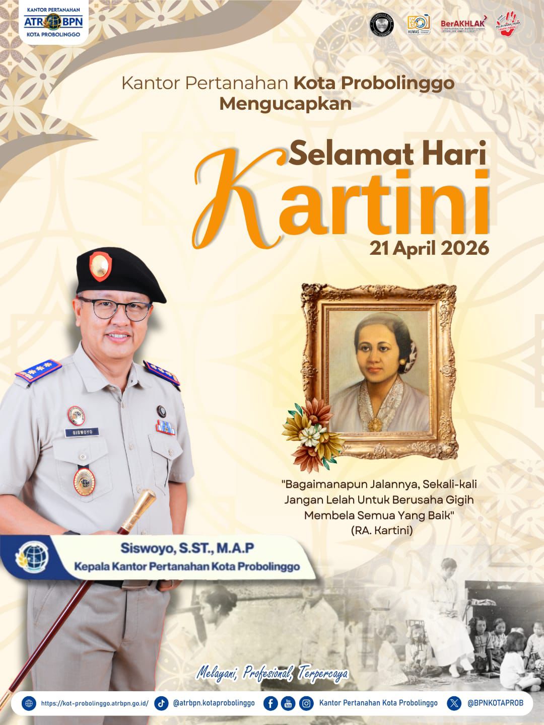 Segenap Keluarga Besar Kantor Pertanahan Kota Probolinggo mengucapkan selamat memperingati Hari Kartini 2026.