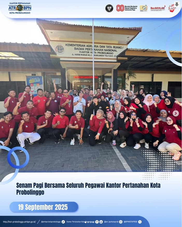 Pada Hari Jumat, 19 September 2025 Senam pagi kini menjadi salah satu olahraga favorit di kalangan masyarakat untuk mengawali hari dengan sehat dan penuh semangat. Hal ini juga tercermin dari kegiatan senam pagi yang dilaksanakan oleh seluruh pegawai Kantor Pertanahan Kota Probolinggo.