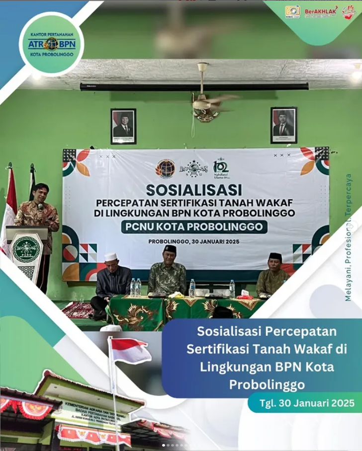 Pada Hari Kamis Tanggal 30 Januari 2025 Bapak Kepala Kantor Pertanahan Kota Probolinggo , Bapak Arli Buchari S.T.,M.M menghadiri Sosialisasi untuk menjadi pemateri dalam acara “Percepatan Sertipikasi Tanah Wakaf” dalam rangka Harlah NU ke 102 yang bertempat di Aula Kantor PCNU Kota Probolinggo. Kegiatan Sosialisasi ini juga dihadiri oleh pejabat pengawas beserta koordinator subtansi Kantor Pertanahan Kota Probolinggo.