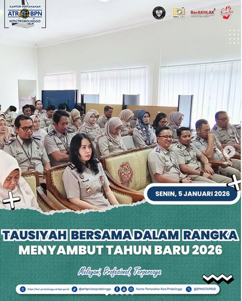 Dalam suasana penuh berkah menyambut Tahun Baru 2026, pada hari ini Senin, 5 Januari 2026 Kantor Pertanahan Kota Probolinggo menggelar kegiatan tausiyah bersama Ustadz Ahmad Muzakki Kholil.