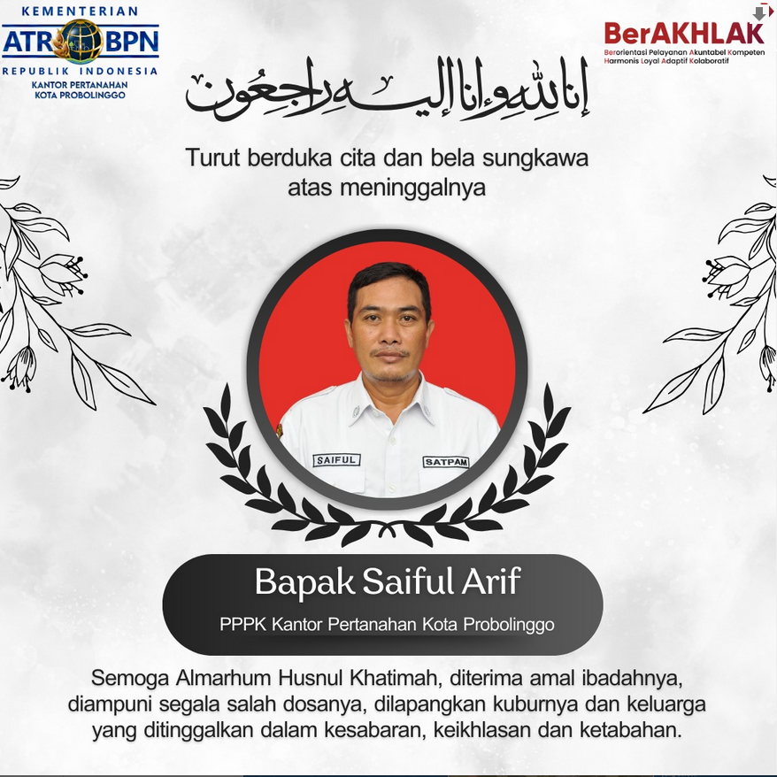 Segenap Keluarga besar Kantor Pertanahan Kota Probolinggo mengucapkan Turut Berduka Cita dan Bela Sungkawa atas meninggalnya Bapak Saiful Arif